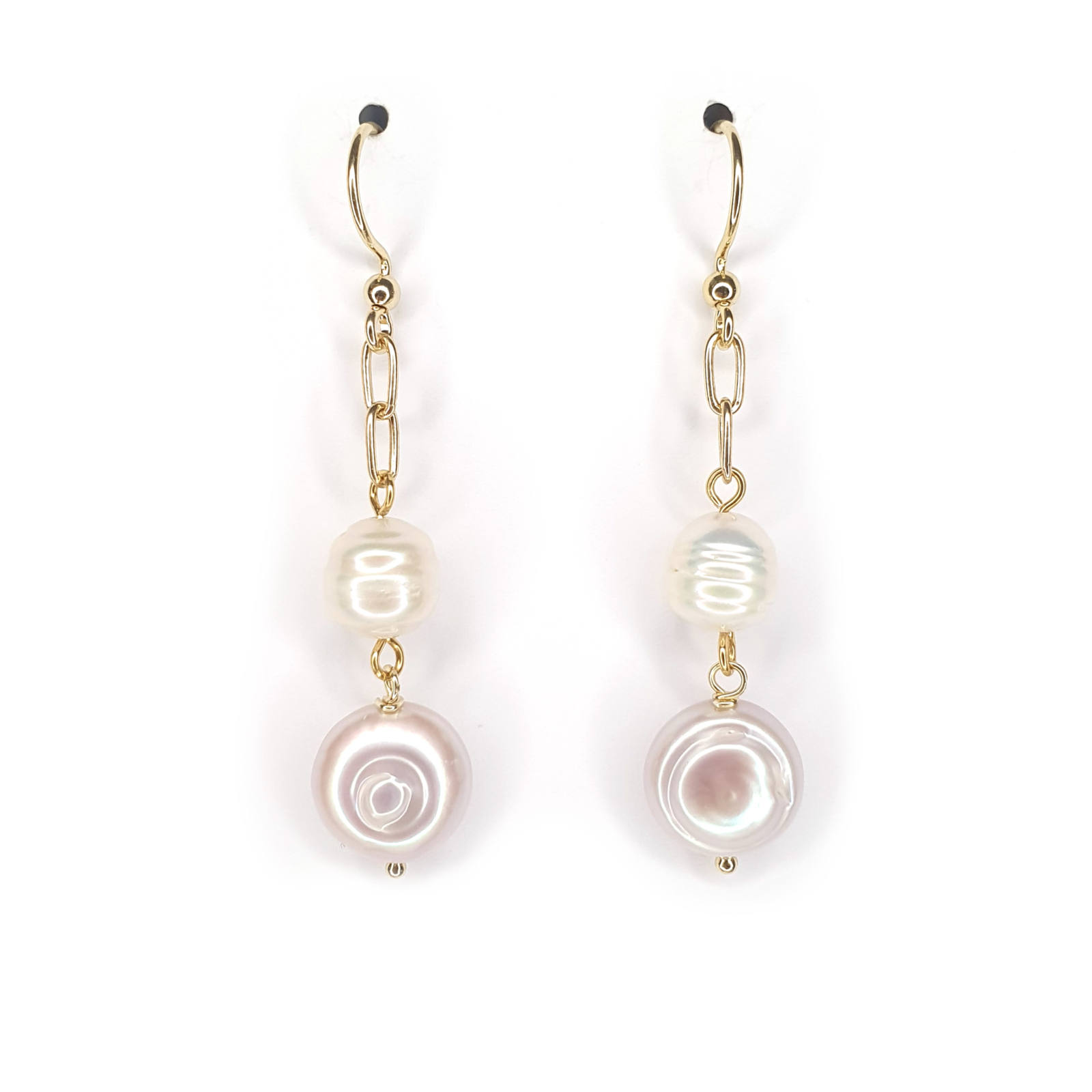 Cercei din argint placat cu aur, cu perle de cultura banut de 10 mm si lantisor cu zale groase