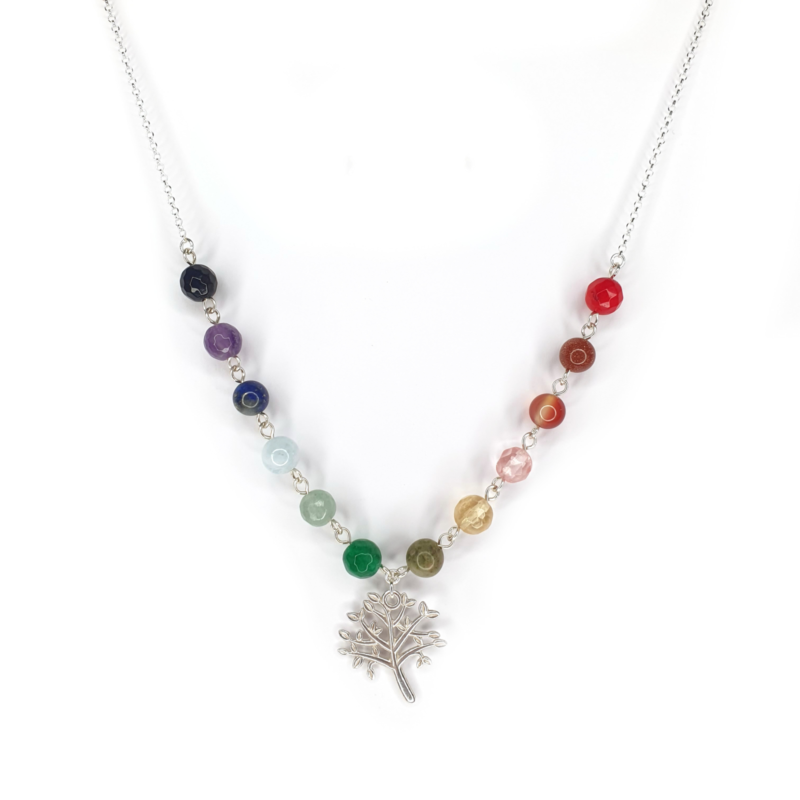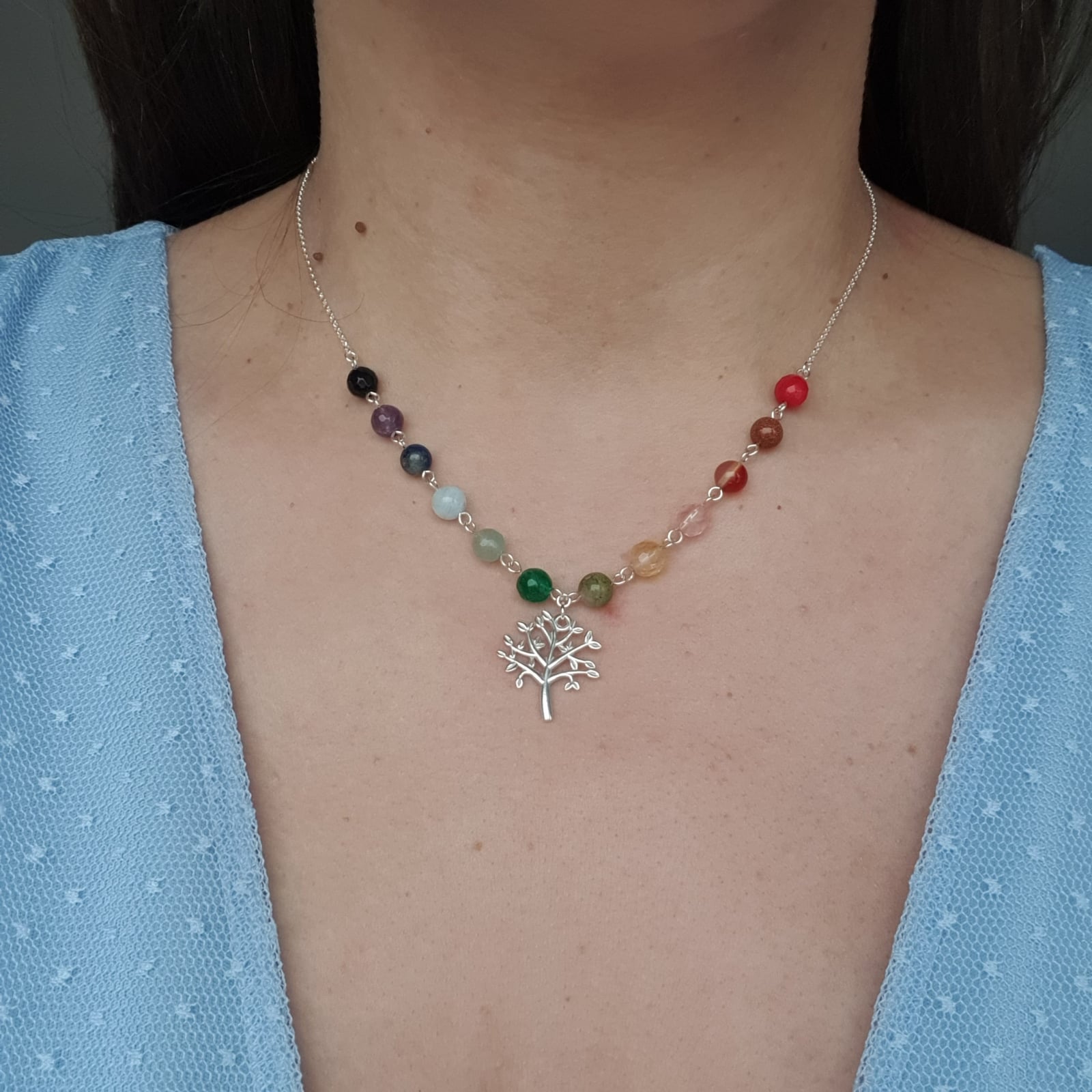 Colier cu pietre semipretioase sfere de 6mm, in nuantele curcubeului si pandantiv copacul vietii
