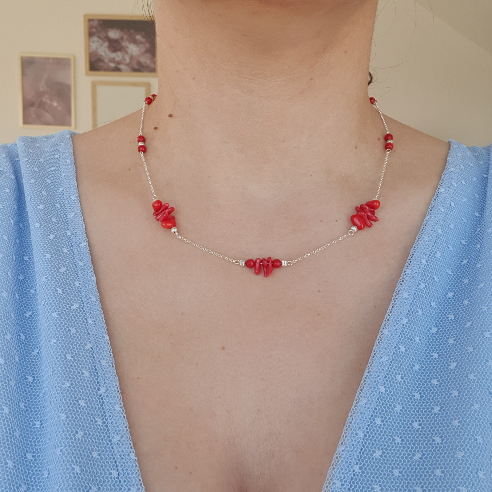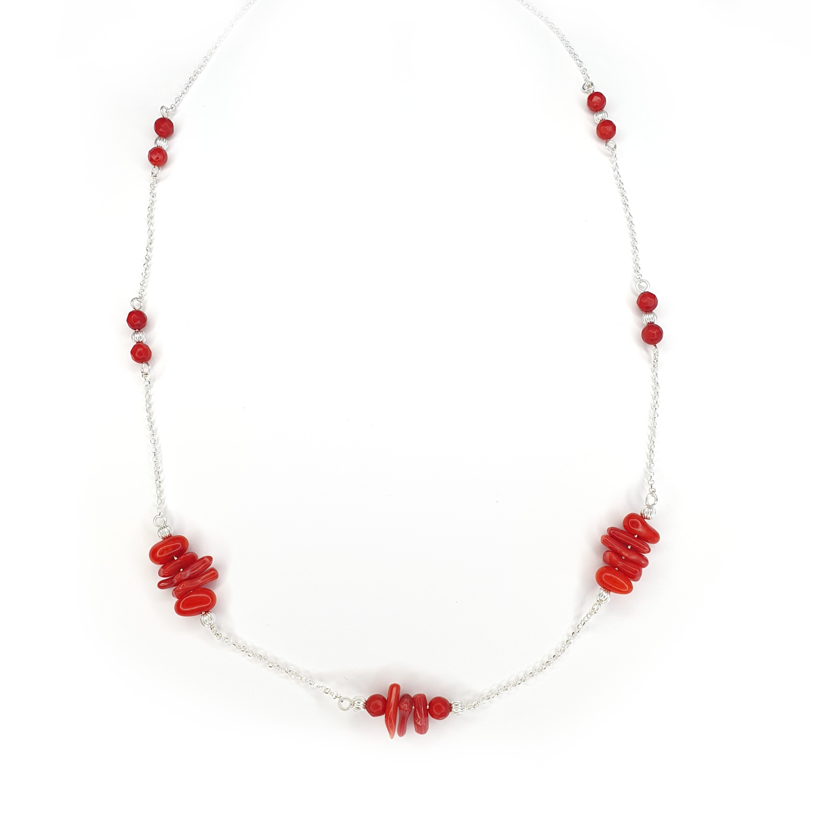 Colier din argint cu pietre semipretioase coral de 4mm, dispuse in grupuri, cu bilute decorative din argint