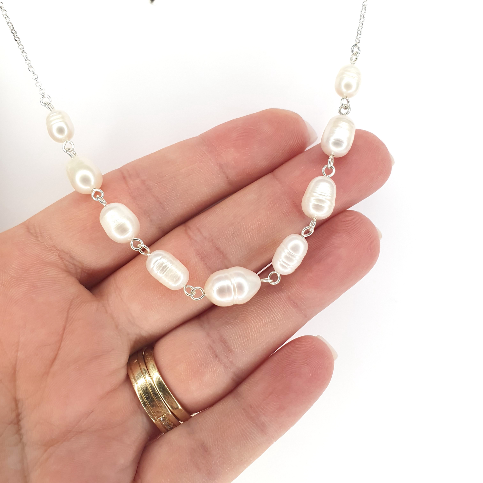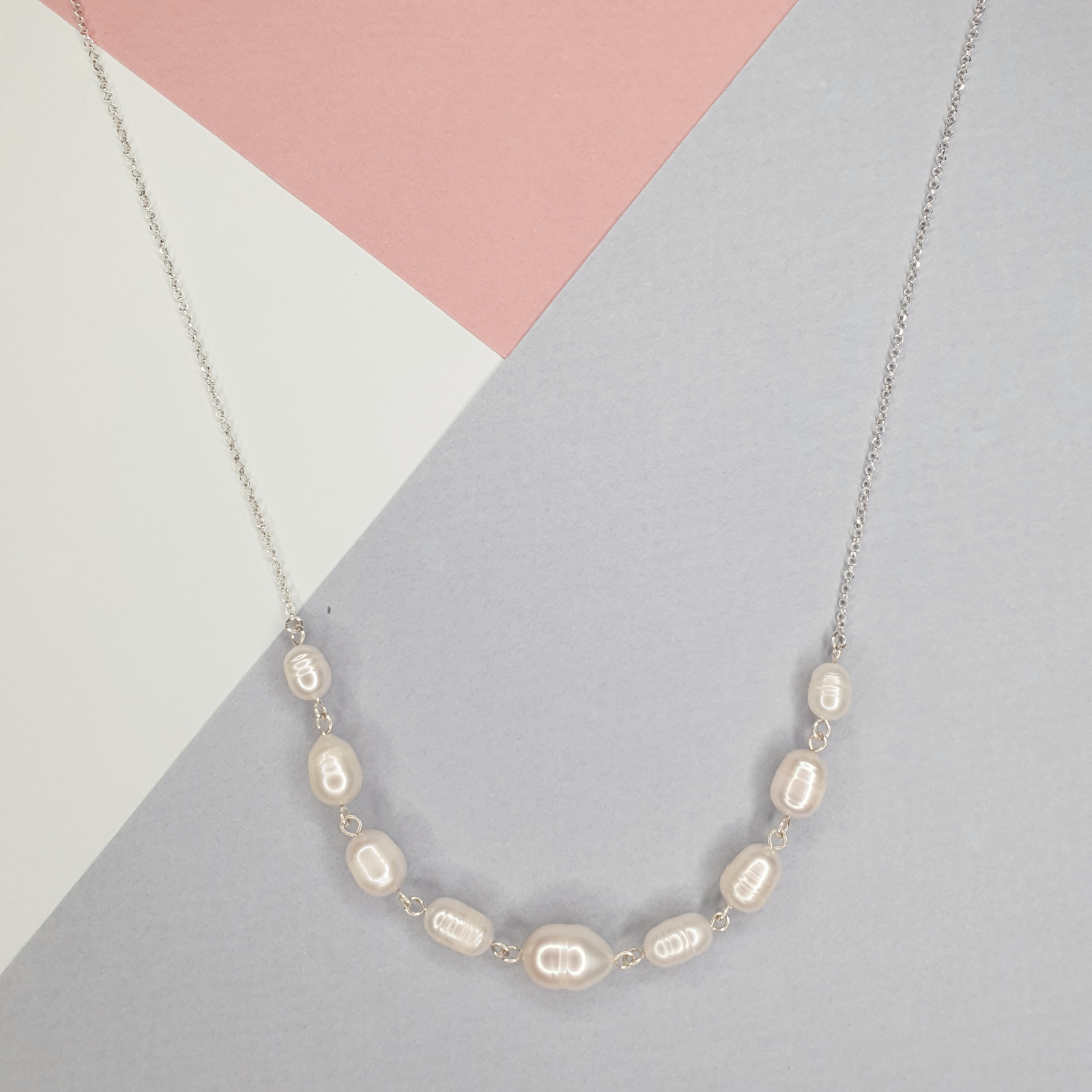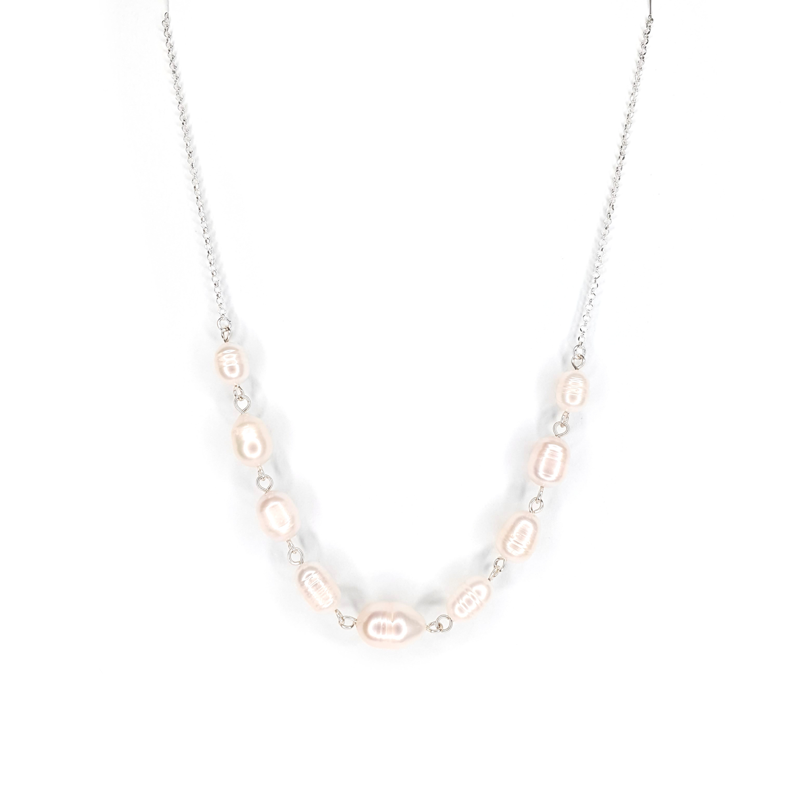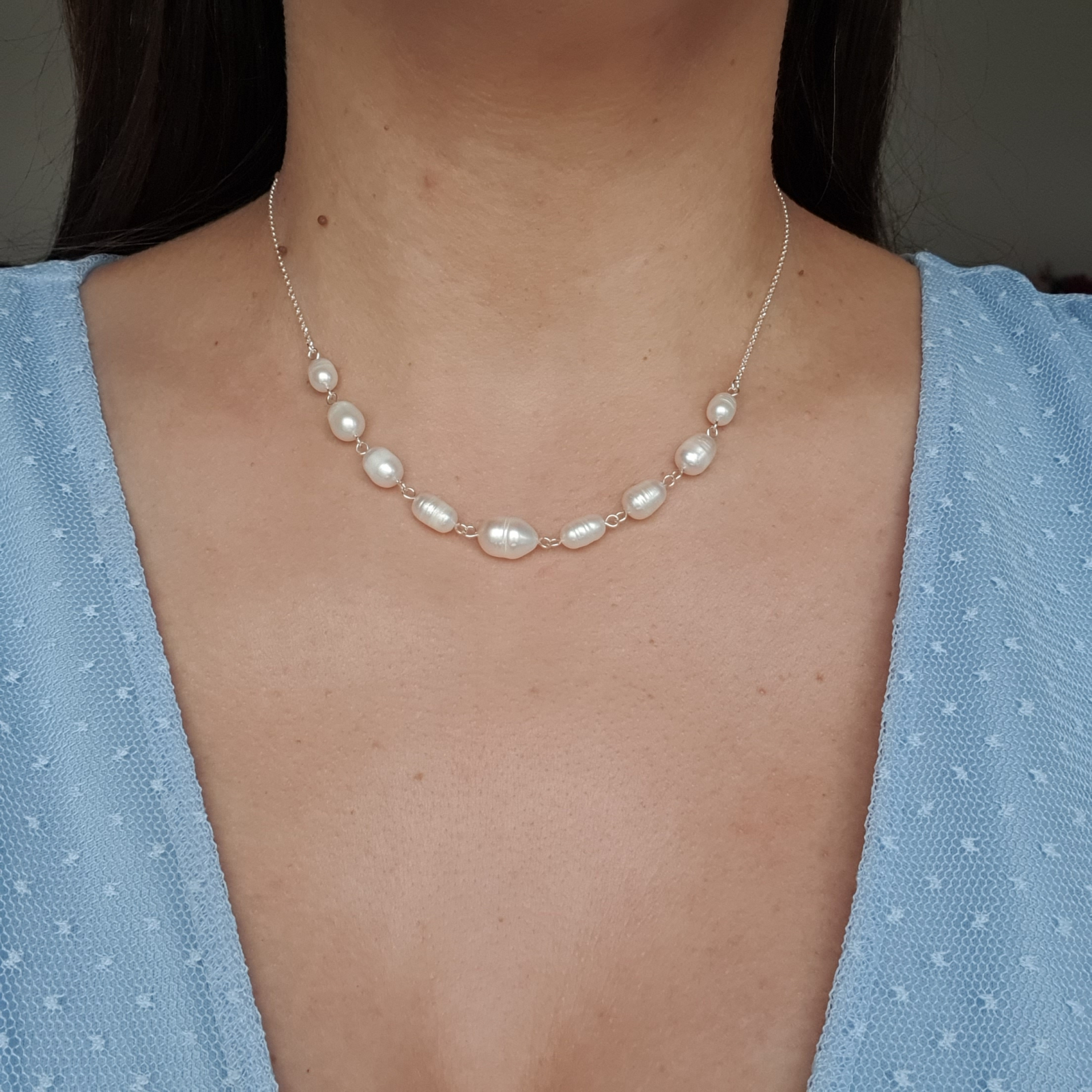 Colier finut, realizat din argint cu o perla de cultura alungita de 9-10 mm