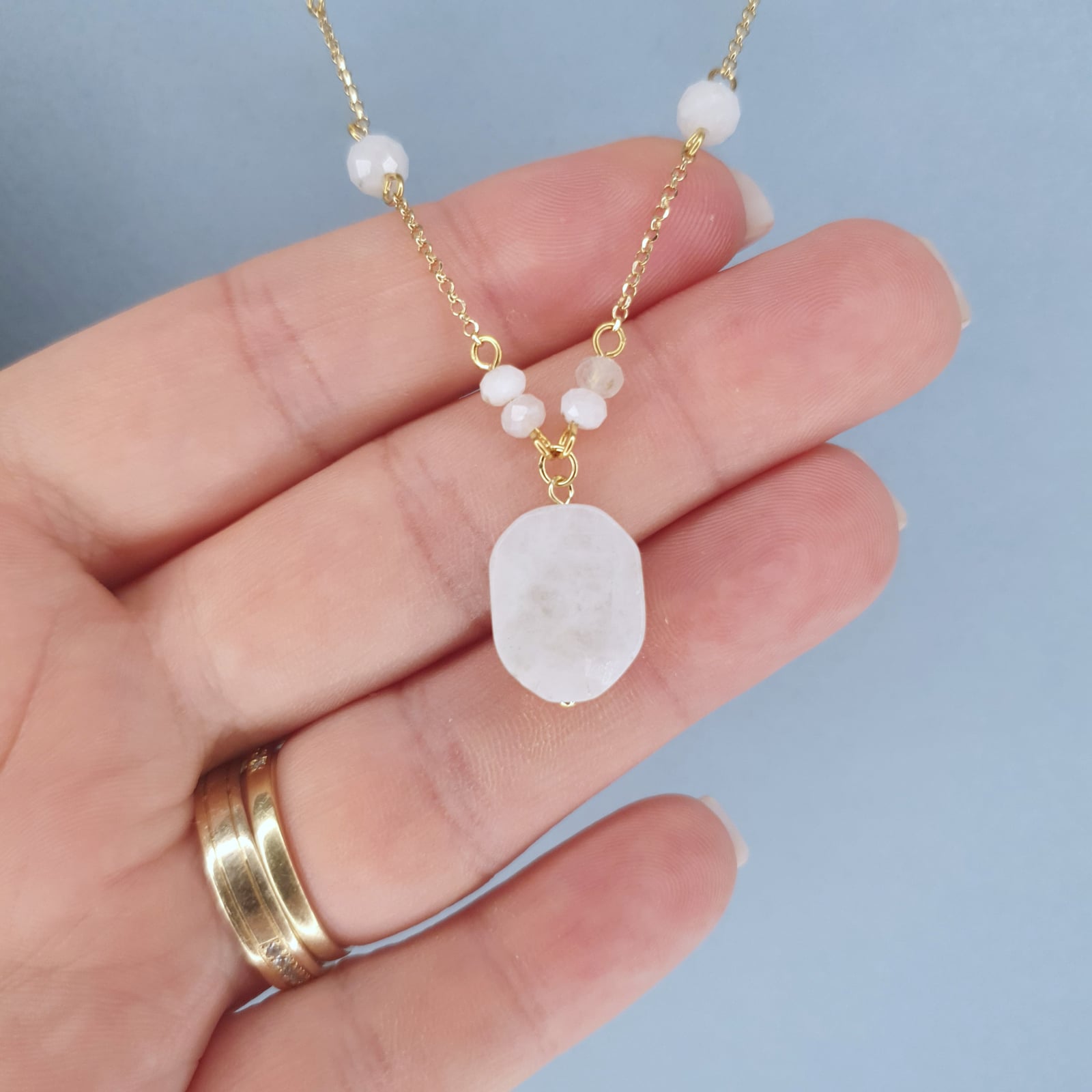 Piatra lunii este o piatră opalescentă, de obicei albă sau gri cu reflexii albastre, care seamănă cu lumina lunii. Duritatea sa este de 6 pe scala Mohs și este adesea folosită în bijuterii pentru frumusețea sa subtilă.